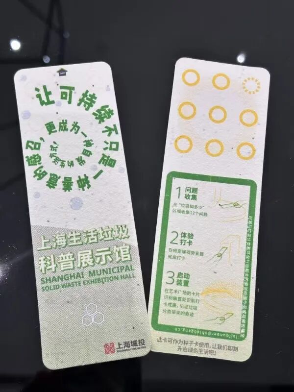 一张使用PHA可降解材料制作并融入了植物种子的特殊互动卡片,在完成参观打卡后,可将其带回家植入土中,让它自然降解并生根发芽,直观感受“无废”理念的奇妙之处。