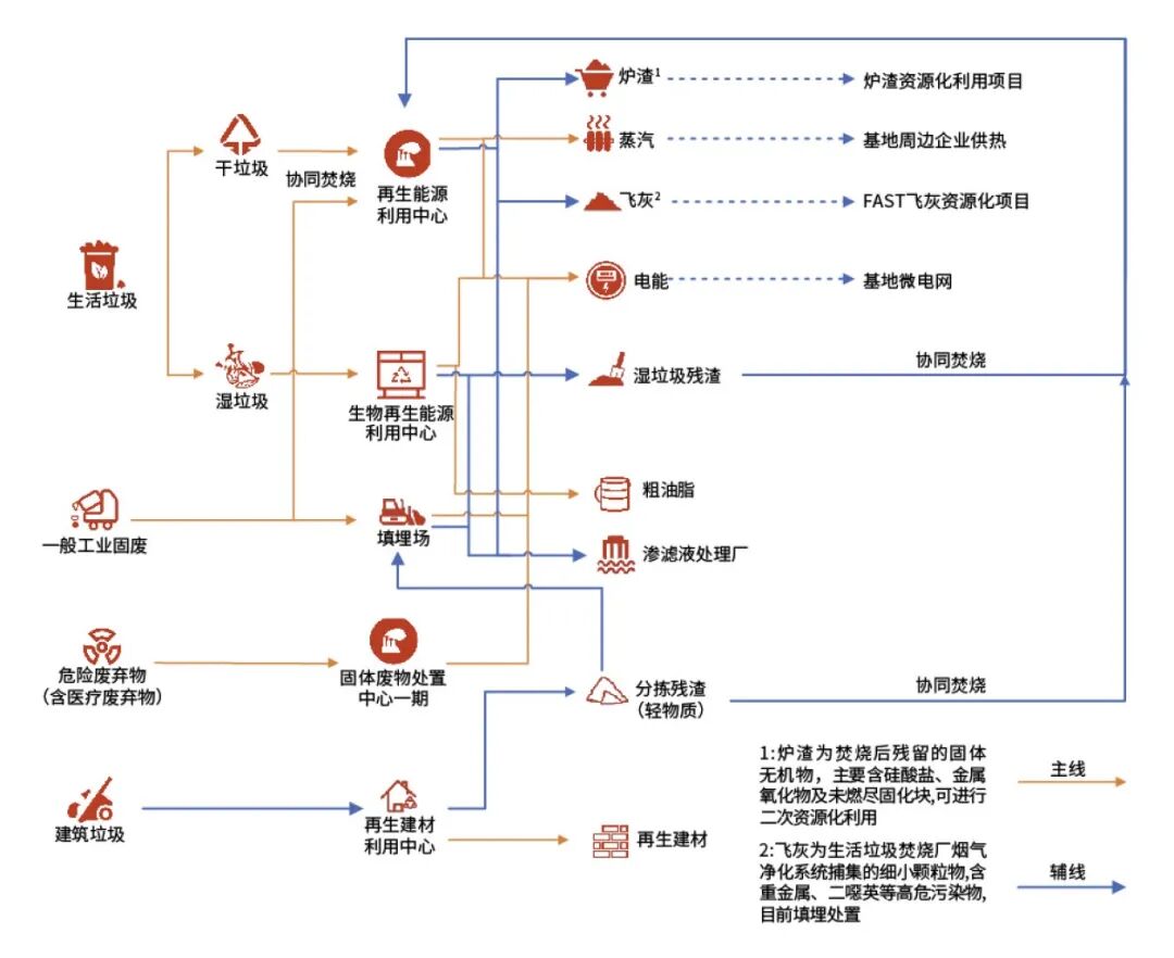 目前老港基地已建成焚烧发电厂、湿垃圾处理厂、建筑垃圾处理厂、医废处置厂、填埋场等一系列末端处理处置设施,并不断科技创新,深入研究基地内二次固废的资源化途径,着力推进炉渣资源化利用项目、飞灰资源化项目、湿垃圾生物资源化等一批循环利用项目,完善循环产业链条。